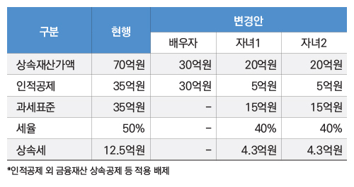 이렇게 되면 자칫 지금보다 상속세를 더 물어야 하는 문제가 생길 수 있다. 이에 변경 안에서는 인적공제의 최저한을 10억 원으로 설정하고 있다. 공제금액의 합계액이 10억 원을 밑돌 경우 그 미달액만큼 추가 공제가 가능하게 한 것이다. 따라서 이상의 경우에도 자녀가 10억 원을 공제받아 상속세가 발생하지 않는다.